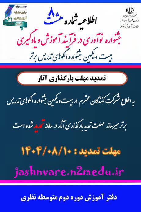 ✳️ تمدید مهلت بارگذاری آثار جشنواره الگوهای تدریس برتر تا ۱۰ آبان ماه✳️ تمدید مهلت بارگذاری آثار جشنواره الگوهای تدریس برتر تا ۱۰ آبان ماه